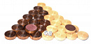 Фишки для нард и шашек диаметром 27 мм, высотой 8 мм и весом чуть больше 3х грамм. Сделаны из бамбука и имеют мягкую подложку.